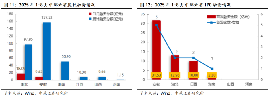 对比中部六省股权融资规模和数量,8月份,湖北有1家公司增发融资18.09亿元,安徽有1家公司增发融资9.62亿元,其他四省均无股权融资。1-8月份,安徽11家公司合计融资157.52亿元,保持居六省第一;湖北有8家公司融资97.85亿元,规模居六省第二;湖南6家公司融资50.90亿元,规模居六省第三;江西有2单IPO,山西、河南分别有1家公司增发,整体融资规模相对有限。