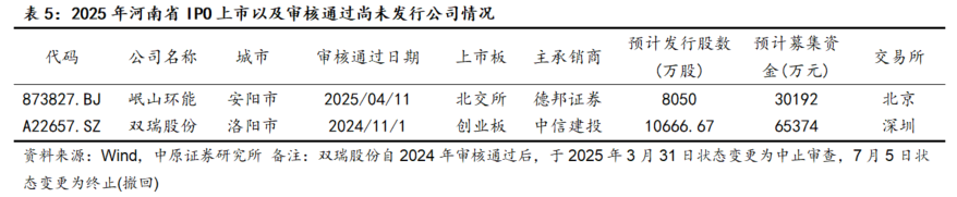 截至8月底,河南省IPO审核通过尚待发行公司1家,为拟在北交所上市的岷山环能。