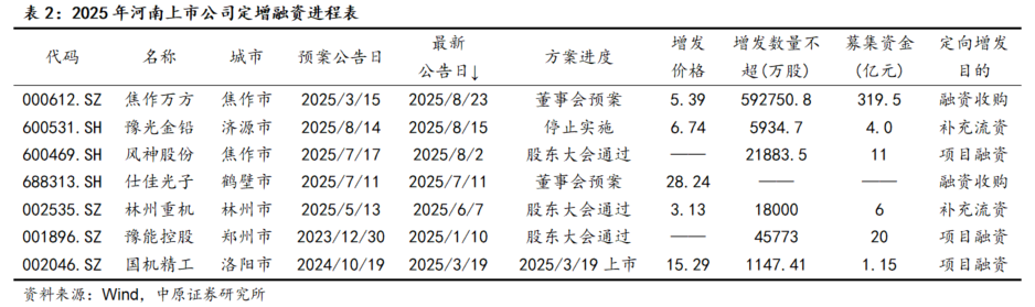 按照最新公告日统计,2025年8月份以来,河南新增3家上市公司更新增发进展。其中:焦作万方更新增发预案,风神股份增发预案通过股东大会,豫光金铅发布增发预案后又停止实施。目前,河南增发融资的途5家公司中,有2家通过董事会、3家通过股东大会。5家预计合计定增融资超过356.49亿元,分别1家科创板和4主板上市公司。