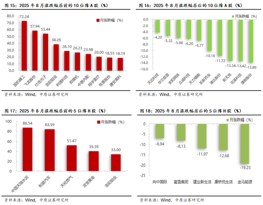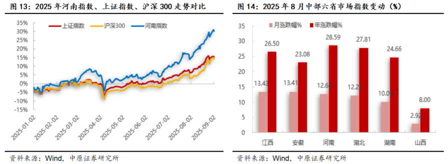 8月份,在730中央政治局会议“坚持以科技创新引领新质生产力发展”的部署下,国务院先后出台了《关于深入实施“人工智能+”行动的意见》推动科技创新产业发展,加之美联储9月降息概率逐步转为确定性的有利国际环境下,A股核心指数呈现了以科创50和100指数领涨的大幅上涨。因此,一方面,建议在持续关注河南省科技创新相关上市公司的投资机会的同时注重回避短期市场波动风险;另一方面,关注河南半年报业绩保持持续增长的相关公司。