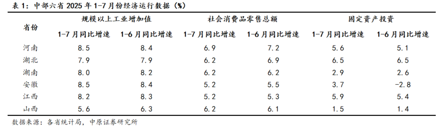 消费方面,中部各省消费增速多数放缓。其中,河南省社零增速虽有所回落,但仍以6.9%的增速位列中部首位;山西省和湖南省是唯二消费增速没有放缓的省份,1-7月均以6.2%的增速位列第二位。