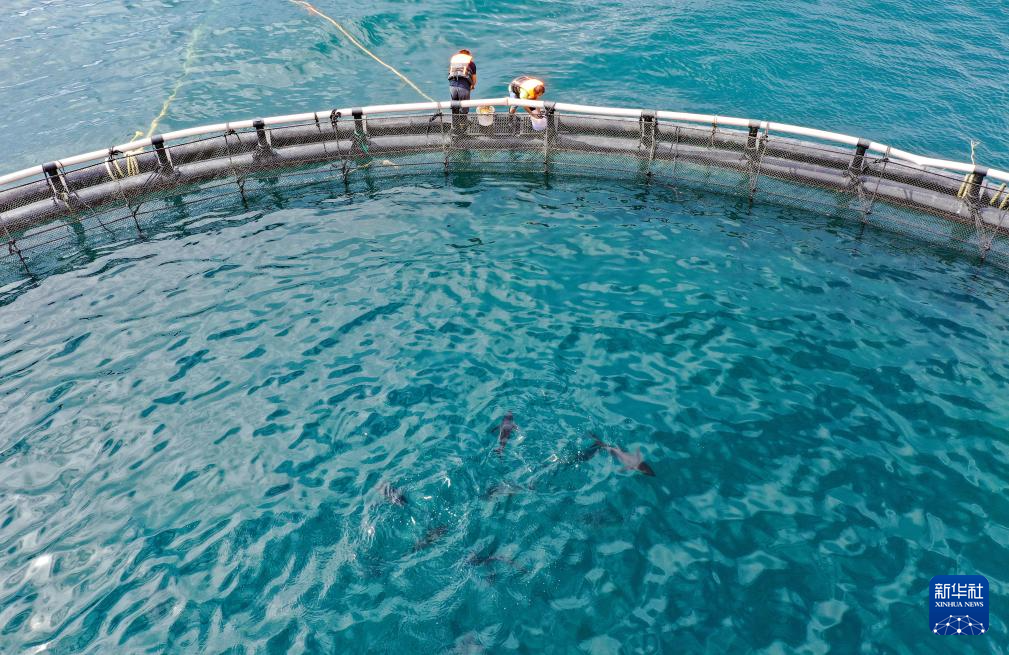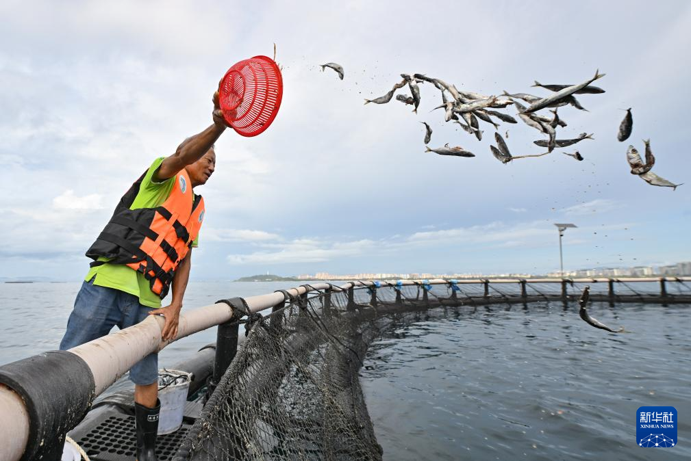 9月17日,陵水黄鳍金枪鱼海上养殖示范基地工作人员在投喂金枪鱼。