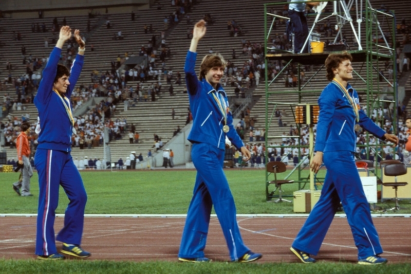 1980年奥运会,玛丽塔・科赫(中)、克拉托赫维洛娃(左)分别获得女子400米冠亚军