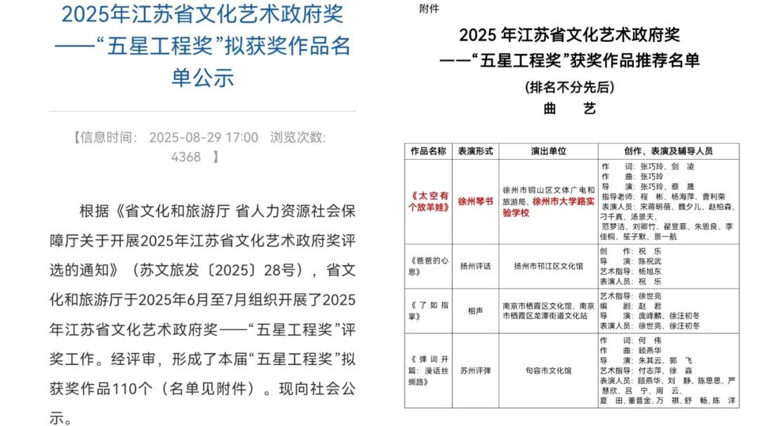 近日,从江苏省文化和旅游厅传来喜讯。在2025年6月底举办的江苏省“五星工程奖”(政府奖)评选活动中,徐州市大学路实验学校“徐州琴书艺术团”凭借原创节目《太空有个放羊娃》脱颖而出,荣获“五星工程奖”。据悉,该奖是江苏省群众文化领域的最高政府奖项,徐州市大学路实验学校一举夺魁,实现了铜山区在该奖项上“零的突破”,也是徐州市多年来首次由学生团体斩获此项殊荣。