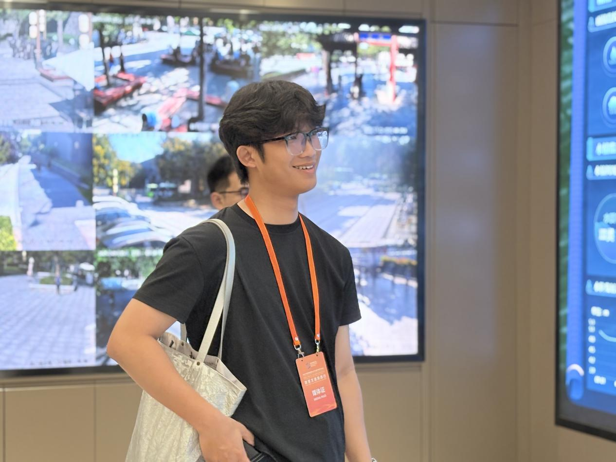印尼网红博主在西安城墙数字方舱综合管理平台认真观看城墙监测数字大屏