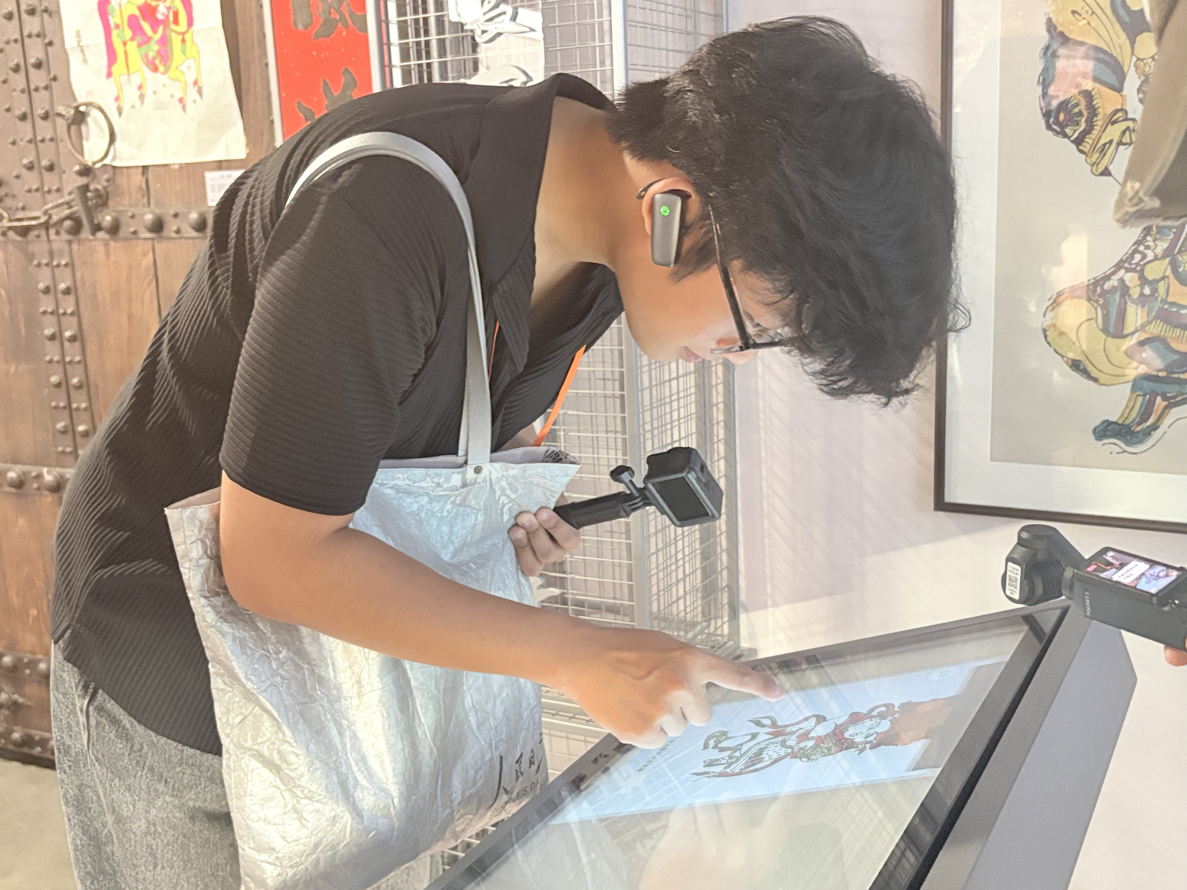 印尼网红博主在陕西省文化馆互动区域的电子屏幕上体验版画套色