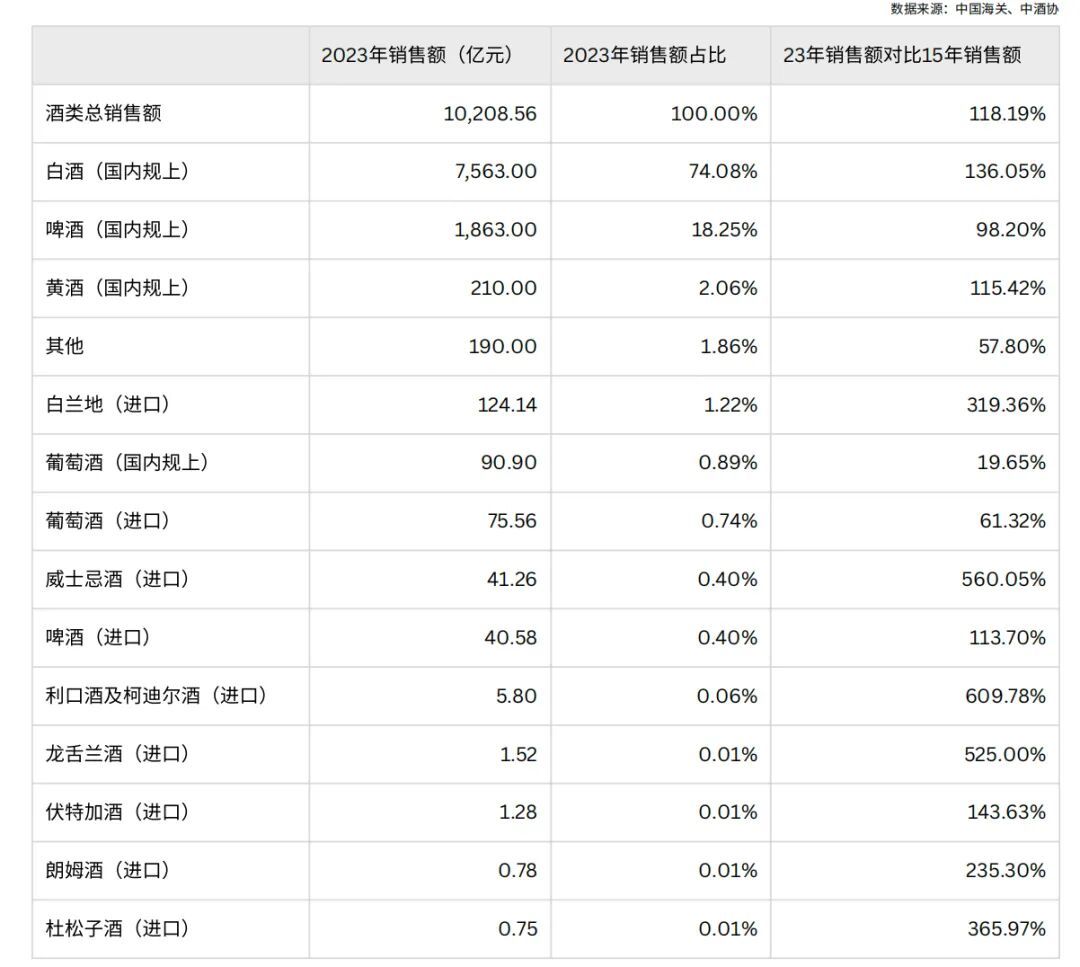 尽管酒类总产能呈现明显下滑,行业整体销售额却增长18.19%,主要推动力来自白酒板块。在白酒产能下降68.43%的背景下,其销售额实现136.05%的大幅提升,可能与近年来行业去库存及产品结构优化有关。