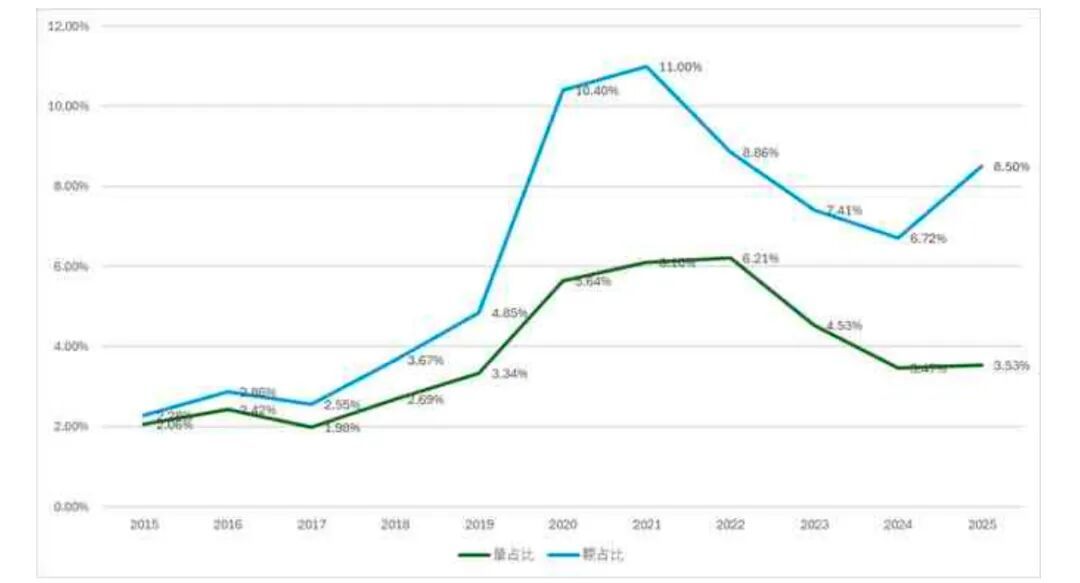 具体至英国威士忌的进口表现,其进口规模总体呈现先升后降的态势,但在全国威士忌进口总量和总额中的占比持续下滑。数据显示,英国威士忌的进口量占比从2015年的84.53%下降至2025年的75.65%,减少8.89个百分点;进口额占比下降幅度相对较小,为4.11个百分点。