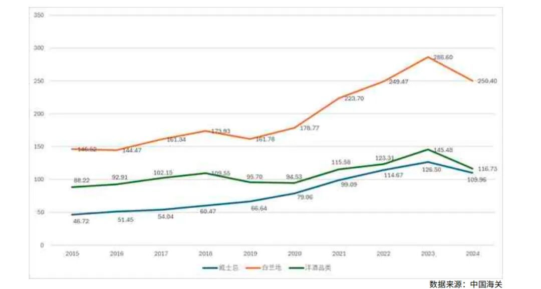 日本威士忌进口量额整体呈上升趋势,尤其在2018至2020年间增速显著。尽管2021年后一度有所回落,但自2024年起重新恢复增长,但依然未达到2021年的最高峰。