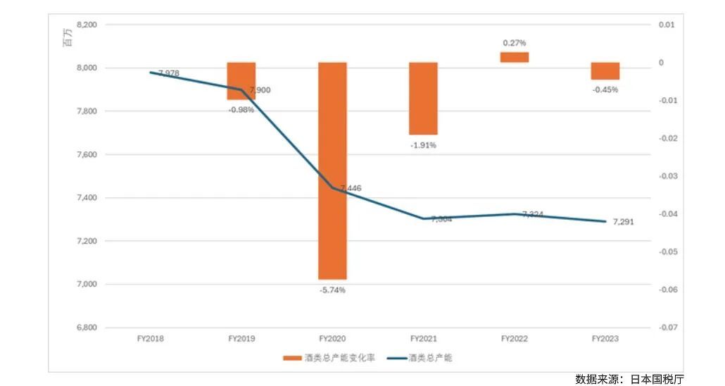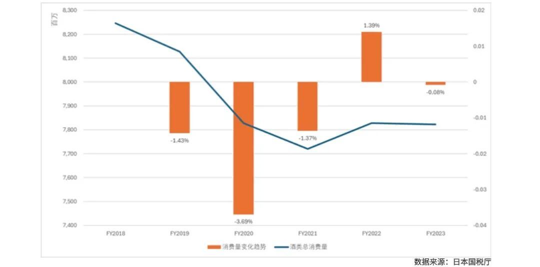 可以看到日本酒类消费量也呈现了明显的下滑趋势,但下滑不明显,仅5.15%。