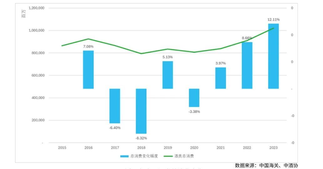 ▍近10年中国酒类总消费变化