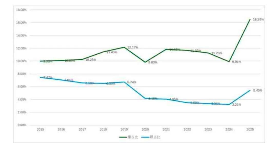 美国威士忌的进口量占比长期保持相对稳定,但在2025年上半年出现明显提升,从9.99%抬升到16.53%;其进口额占比整体呈小幅下滑趋势,在2025年上半年亦有所回升,达到5.45%,占比依然较小。