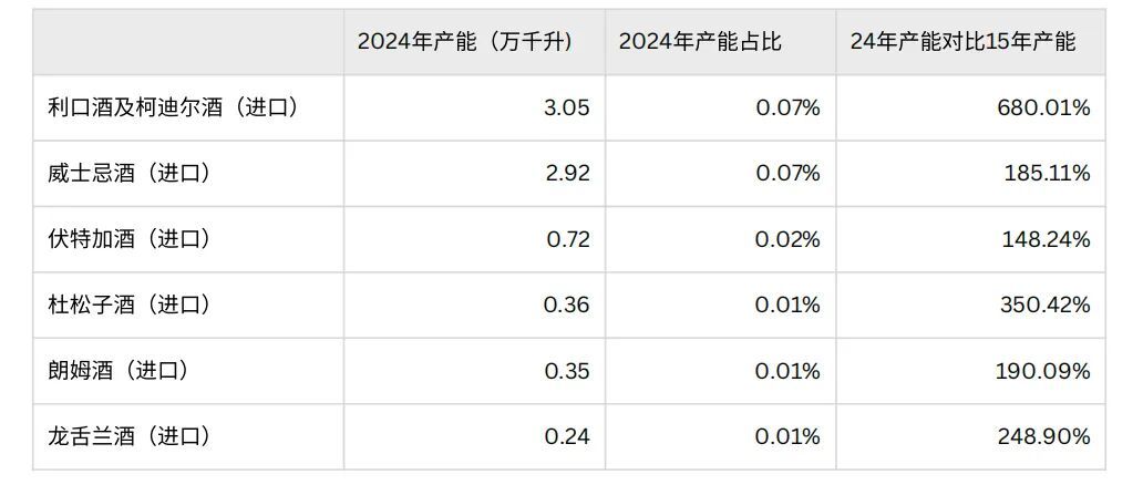 在主要酒种中,2024年啤酒产能较2015年下降25.33%,白酒产能下滑68.43%,葡萄酒产能下滑最严重,达到76.83%,国产葡萄酒下滑更是达到惊人的89.72%,当前产能仅2015年的十分之一。而占比不足0.3%的小众酒类则普遍实现显著增长,其中利口酒与金酒增速最为突出。