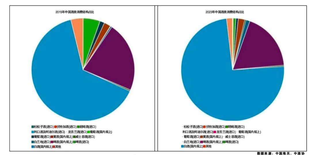 结合图表可见,由于葡萄酒消费在近10年间显著下滑,白酒在中国酒类消费总额中的占比进一步提升约10个百分点,反映出市场集中度有所提高。