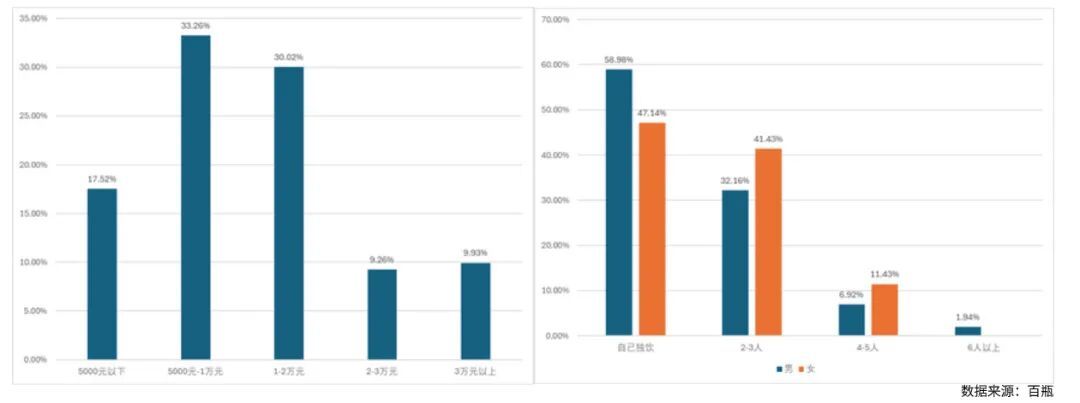 其次,女性消费力量崛起,重塑消费场景。根据威士忌社区百瓶的数据显示,2024年新注册用户中女性威士忌用户占比已攀升至35%,且同样呈现年轻化趋势,00后和95后女性成为增长主力。值得注意的是,女性在多人饮用场景(2-5人)中的占比远高于男性,表明她们更倾向于在社交分享中享受威士忌,这也推动了威士忌在聚会、佐餐等日常场景的“开瓶”消费。