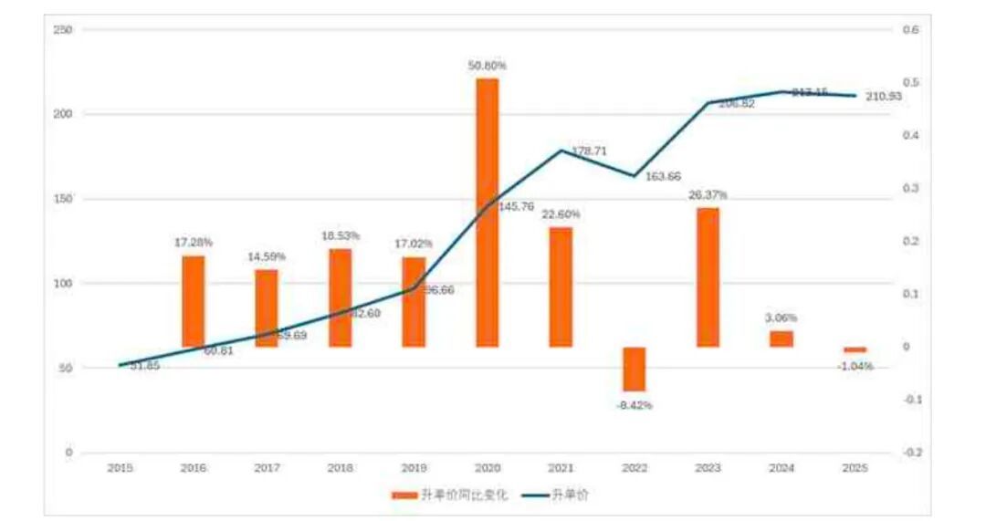 而日本威士忌的进口升单价则始终保持稳步上涨的趋势,十年间自51.85元/升上升至213.15元/升,累计增长逾四倍。