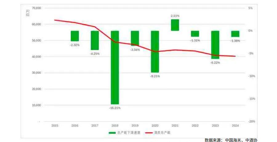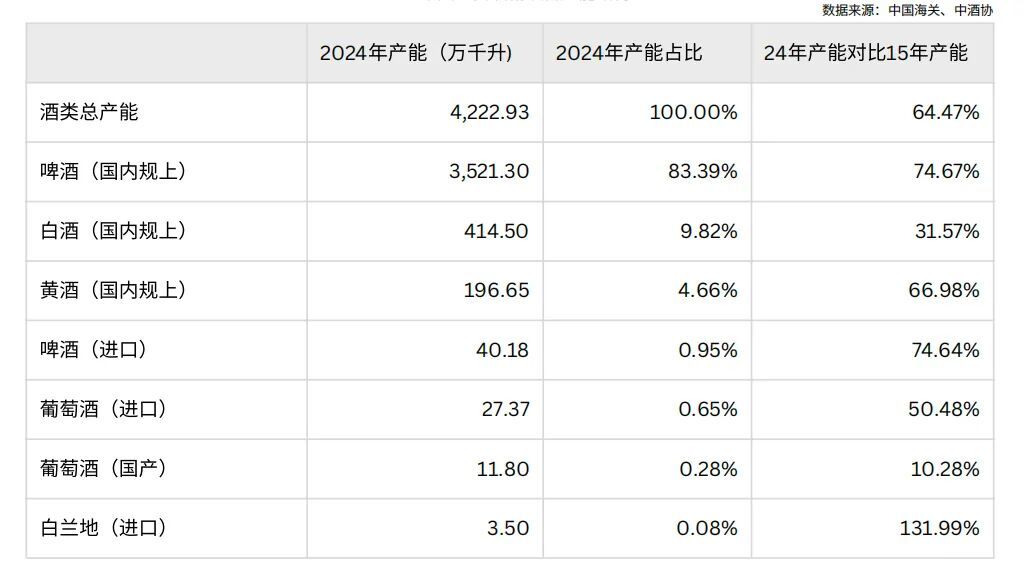 从总产能来看,2015年以来中国酒类总体产能(含进口量)呈明显下滑趋势,2024年总产能仅为2015年的64.47%,累计下降约35.53%,下滑幅度显著。2020年来产能降幅逐步收窄,整体趋于稳定。