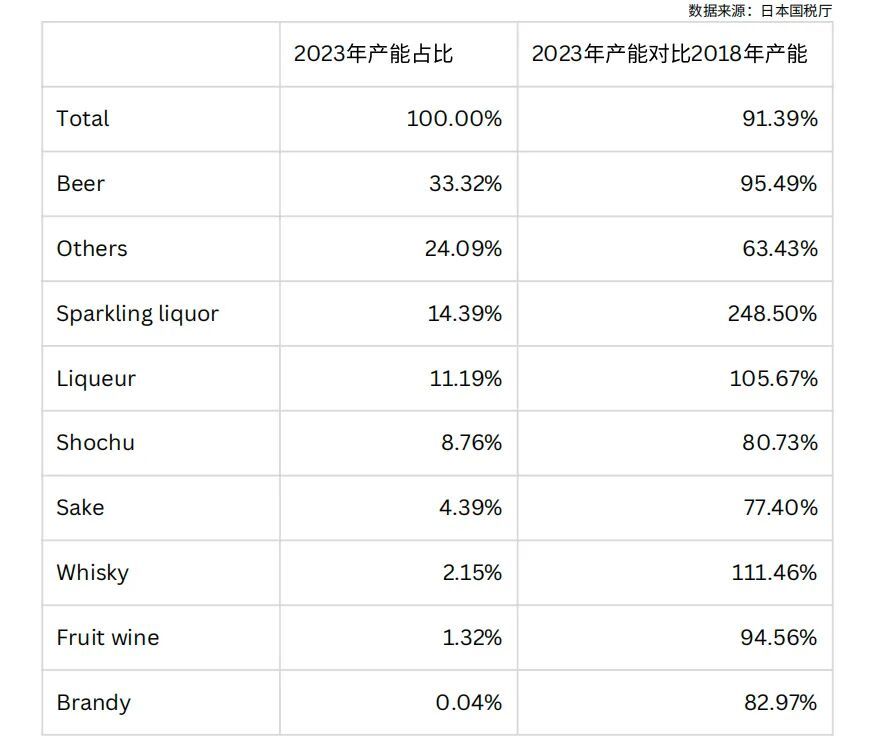 从细分品类来看,日本多数酒类产能均呈现下滑态势,但气泡利口酒(以和乐怡为代表)实现显著增长,威士忌与非气泡型利口酒也保持扩张。