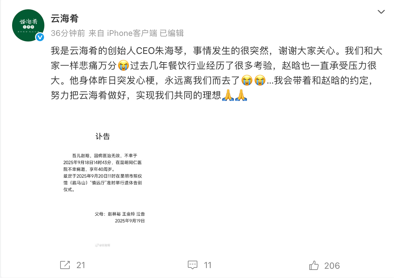 9月19日下午,云海肴官微发布讣告:“我是云海肴的创始人CEO朱海琴,事情发生的很突然,谢谢大家关心。我们和大家一样悲痛万分。过去几年餐饮行业经历了很多考验,赵晗也一直承受压力很大。他身体昨日突发心梗,永远离我们而去了。我会带着和赵晗的约定,努力把云海肴做好,实现我们共同的理想。”