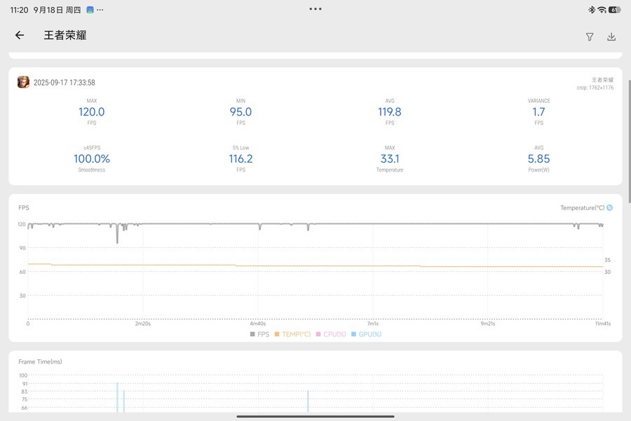 在《王者荣耀》游戏中,小米平板8 Pro在高清画质下玩一局游戏平均帧率可以达到119.8FPS,全程都很丝滑。