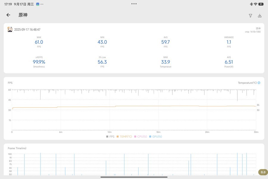 游戏测试部分,我们以《原神》作为测试项目,在全高画质的30分钟跑图测试中,我们这台小米平板8 Pro的平均帧率达到了59.7FPS,整体的游戏体验还是很流畅的。