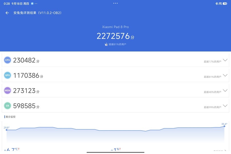 在最新版的安兔兔跑分中,我们这台小米平板8 Pro取得了2272576分的成绩。