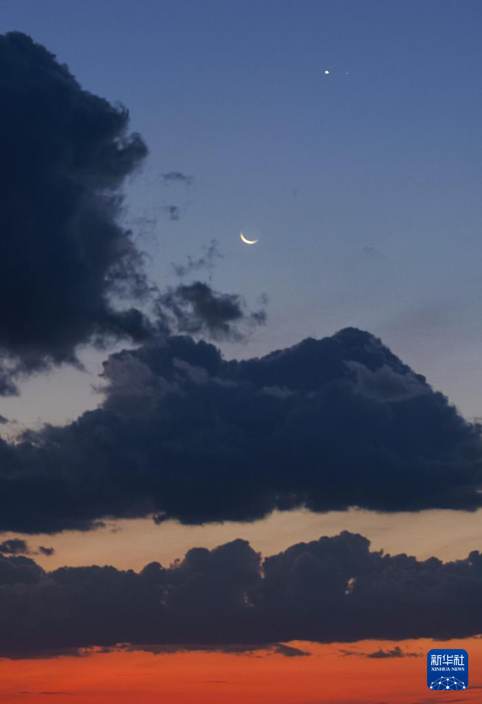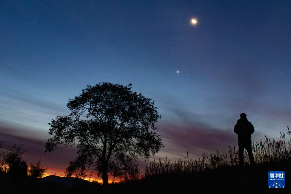 9月19日和20日凌晨,天宇上演一场别样的“星月对话”。亮白色的金星靠近蓝白色的轩辕十四,一同现身东方天空,农历月末的残月又恰巧靠近这两颗星星,上演“双星伴月”。