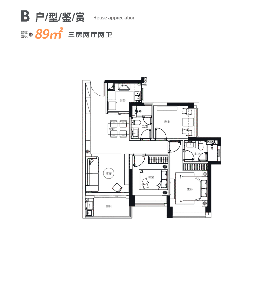 建面约89㎡3房户型,则采用LDKG一体化设计,实现空间“零浪费”,主卧、次卧舒适度相当,整体平衡功能与总价,尤其适合首置家庭。