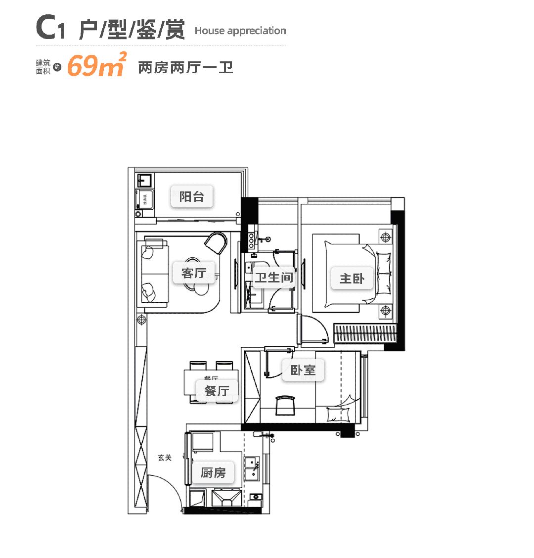 建面约69㎡2房户型,即使是小户型,全屋也能做到明卧、明厨、明卫的“全明空间”。