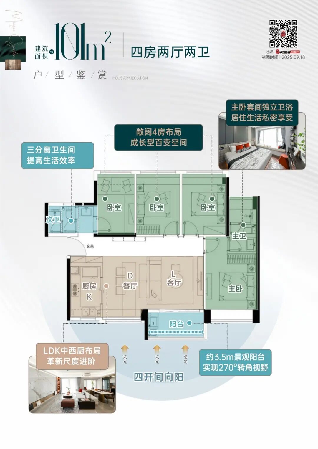 重点来看建面约101㎡4房2厅2卫户型,它罕见地做到 “四开间朝阳+横厅设计”。