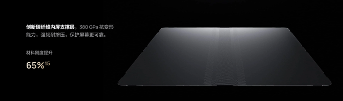 而在内部,创新碳纤维内屏支撑层提供了380GPa的抗变形能力。直面用户的内屏当然也给到了碳纤维级别的支撑。材料刚度相较普通碳纤维材质提升了65%,折叠动作更加自如。