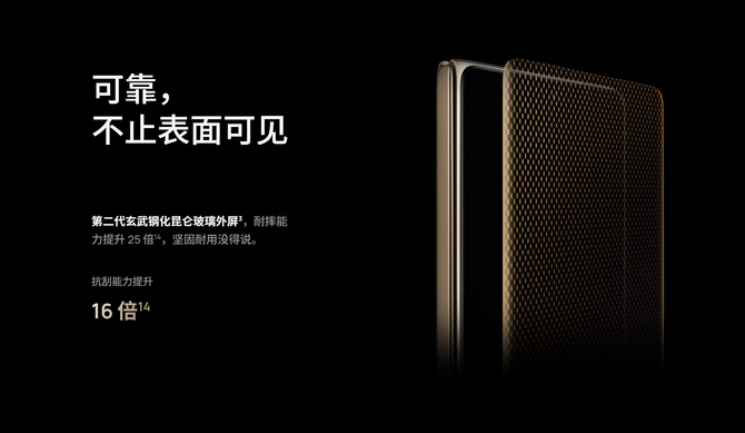 机身强度方面,华为Mate X6 从外到内多管齐下。第二代玄武钢化昆仑玻璃外屏对比一代有着纳米加工技术的优化,在耐摔能力上提升了25倍、抗刮能力提升了16倍。机身放置更放心,大可以像用一款常规手机轻松使用X6。