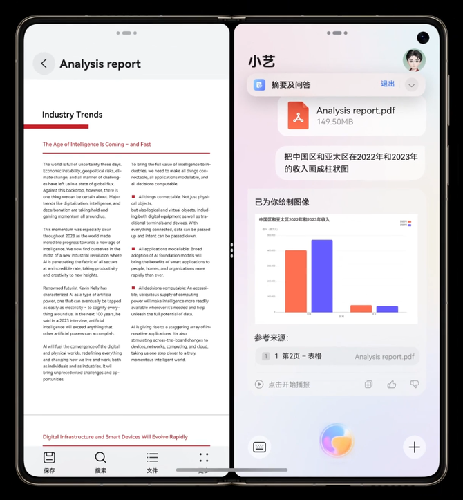 小艺助手能够实现一步调用帮助文档分析。智能分屏后左侧是当前文档,右侧直接整理出了文档对应图表和摘要。