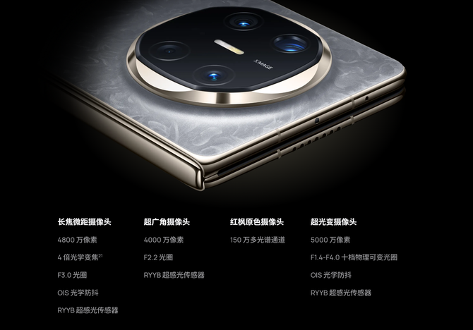 华为Mate X6 在影像方面也有进一步进化。四摄配置合理分工,成像镜头均采用RYYB超感光传感器,对比传统RGGB传感器进一步提升进光量,以提升暗光拍摄能力。