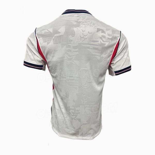 球衣的肩部拼接位置采用了细细的海军蓝滚边,起到低调点缀的效果。而球衣两侧则加入了红色拼接设计,并以深蓝色勾边,形成了动感而现代的视觉效果,为整体简洁的白色外观增添了力量感与活力。