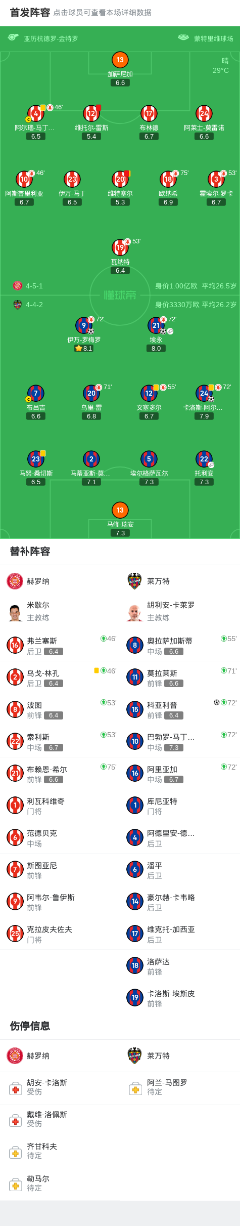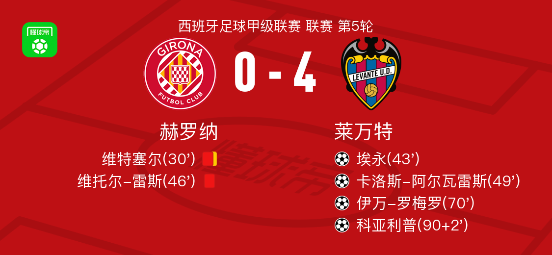 北京时间9月20日西班牙足球甲级联赛 联赛 第5轮,赫罗纳主场对阵莱万特。莱万特埃永破门,卡洛斯-阿尔瓦雷斯破门,伊万-罗梅罗破门,科亚利普破门。最终比分赫罗纳 0-4 莱万特。