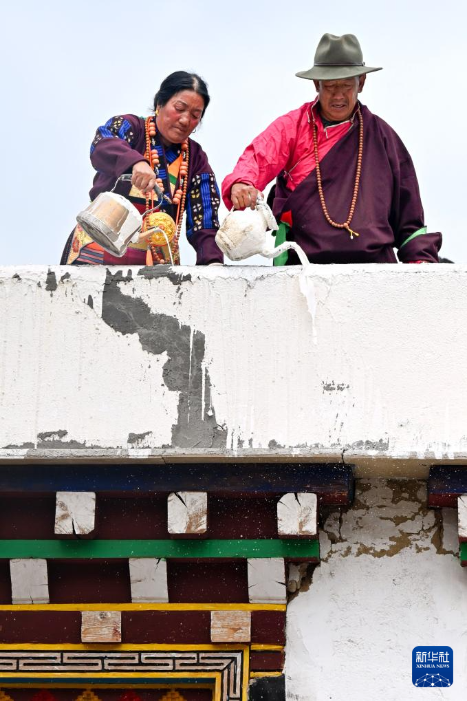 9月20日,在四川省甘孜藏族自治州乡城县青德镇仲德村,一户人家在进行白色灌礼。