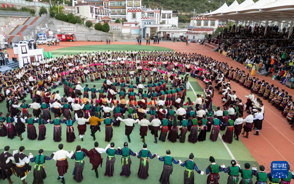 9月20日,在启幕仪式上,当地群众和游客齐跳锅庄(无人机照片)。