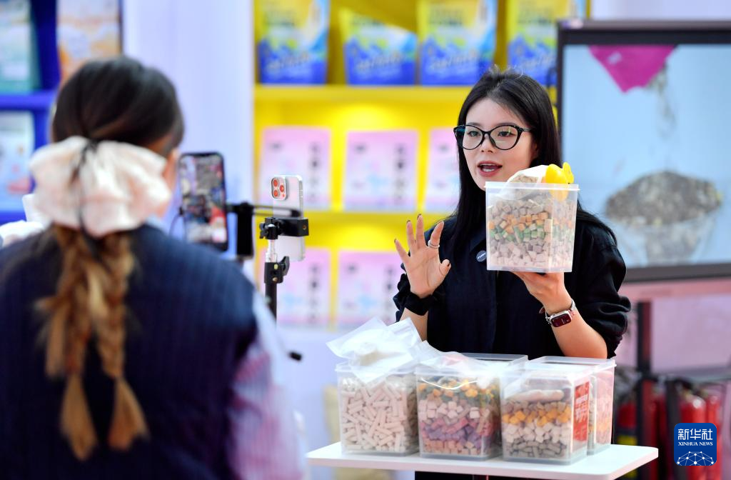 9月20日,客商在宠物产业博览会上直播销售宠物食品。