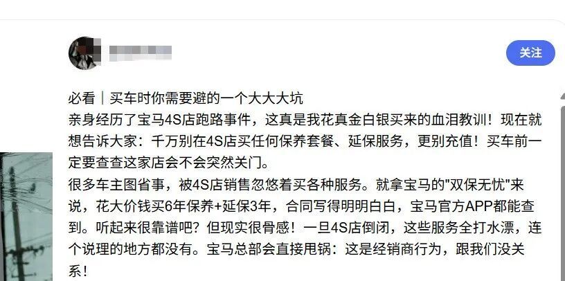 但记者调查发现,王先生的遭遇并非个例。全国多地宝马车主,在社交媒体上“吐槽”,自己在宝马4S店购买的保养套餐、双保无忧延保、维修代金券等权益,因经销商经营变动无法正常使用。