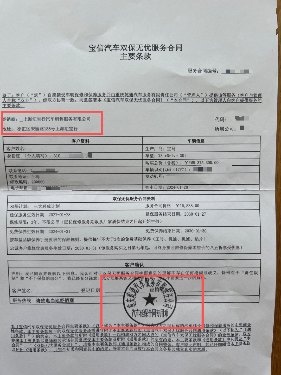 去年1月28日,王先生在宋园路188号的上海汇宝行汽车销售服务有限公司,入手了一辆宝马X3,还额外花15883元购买了 “双保无忧” 延保服务,约定将车辆质保延长至2030年1月底。
