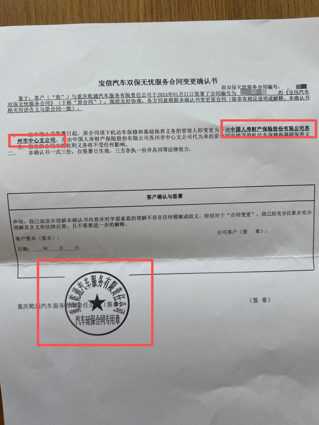 更让王先生困惑的是,他翻出延保合同后发现诸多“疑点”:合同盖章方是重庆乾通汽车服务有限责任公司,而非购车的汇宝行;而且实际提供财险服务的是中国人寿财产保险股份有限公司苏州市中心支公司。