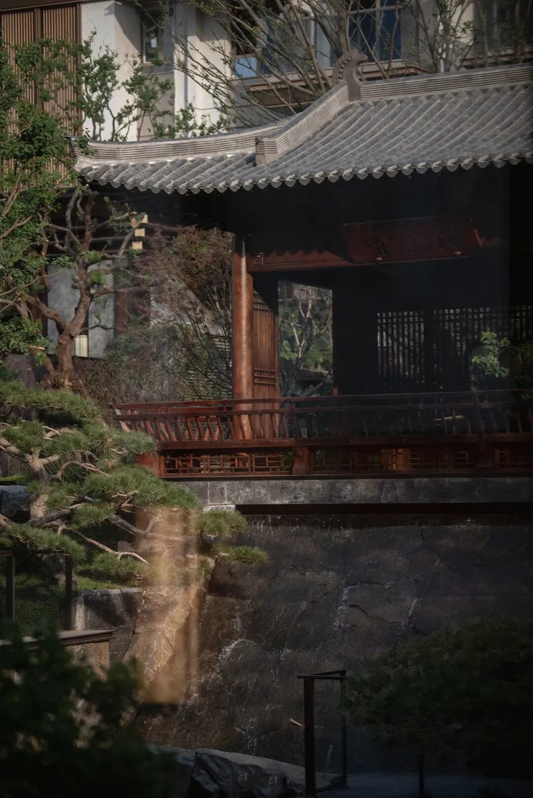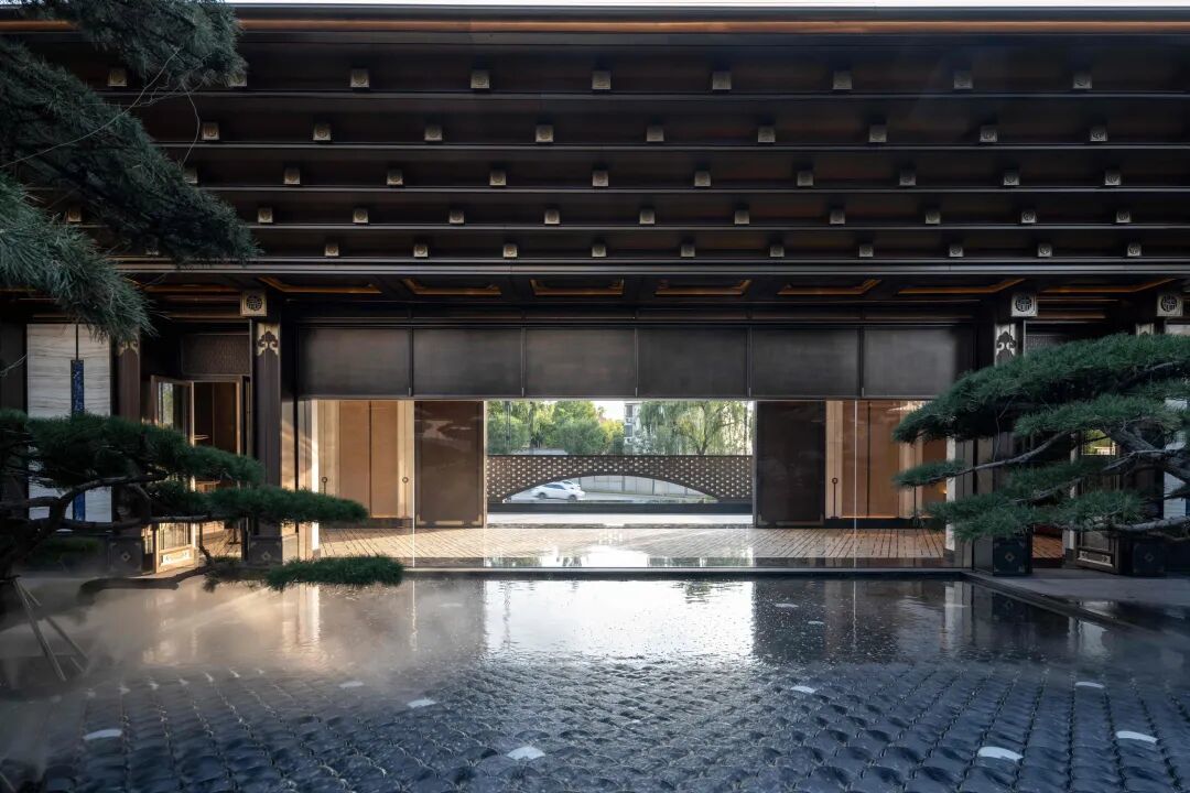 院中五棵造型油松,水景地面龙鳞纹配金镶玉,营造浮屿松韵意境。云游廊复刻颐和园长廊精髓,将传统美学融入生活。