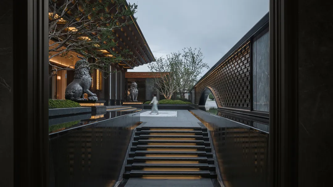 第一道入口宏迎礼门,府门建在高台基座之上,取意唐长安大明宫的第一正殿含元殿中“龙尾道”概念,打造了拾级而上的九层台阶,寓意平步青云。