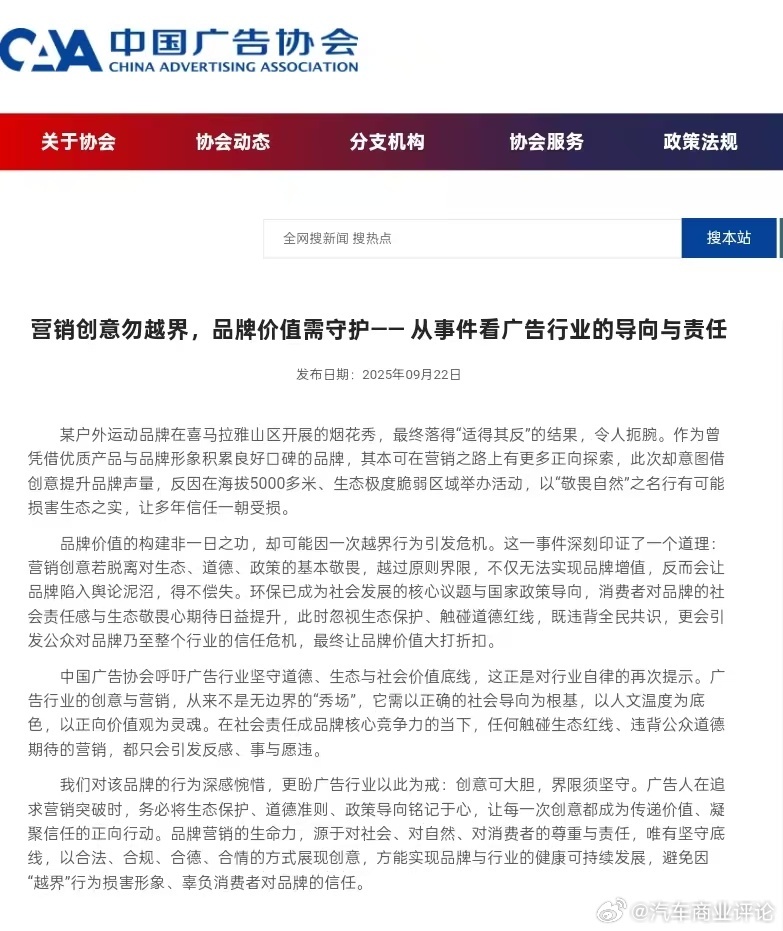 #广告协会再呼吁# 中国广告协会9月22日消息,中国广告协会呼吁广告行业坚守道德、生态与社会价值底线,这正是对行业自律的再次提示。广告行业的创意与营销,从来不是无边界的“秀场”,它需以正确的社会导向为根基,以人文温度为底色,以正向价值观为灵魂。在社会责任成品牌核心竞争力的当下,任何触碰生态红线、违背公众道德期待的营销,都只会引发反感、事与愿违。