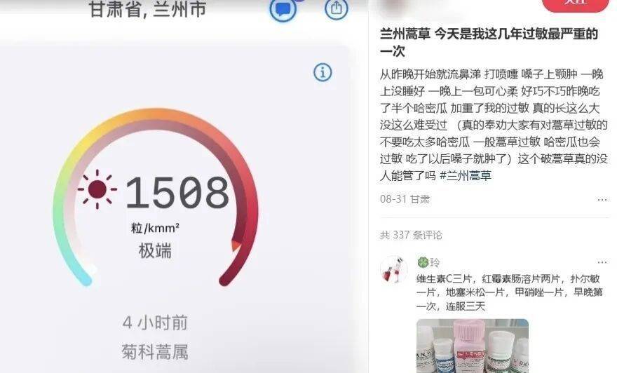 一位兰州网友在社交媒体上表示:“今天是我这几年过敏最严重的一天。”8月最后一天,她开始遭受鼻涕和喷嚏的轮流折磨,嗓子肿起,一宿都没睡好。一款名为“花粉浓度”的工具实时数据显示,兰州当时平均1000平方毫米的空气中含有1508粒花粉,花粉主要来源是“菊科蒿属”植物。