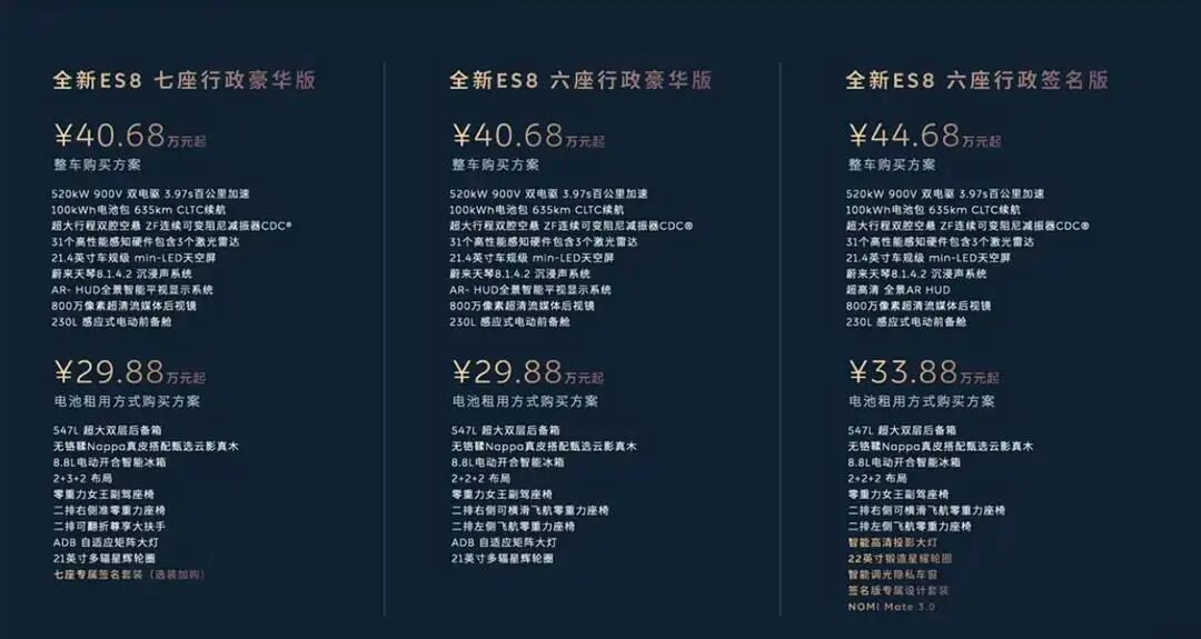 扉旅汽车讯:9月20日,在NIO Day 2025现场,全新一代蔚来ES8正式上市。新车共推出3款配置车型,整车购买售价区间为40.68-44.68万元,采用BaaS(电池租赁)方案购买的售价区间为29.88-33.88万元。作为第三代产品,新车的定价是历史最低,电池租赁的方案来到了30万元以下,这或许也会对ES6、ES7、乐道L90等自家车型产生微妙的竞争关系,创始人一句“活下去”的意义还是很大的。