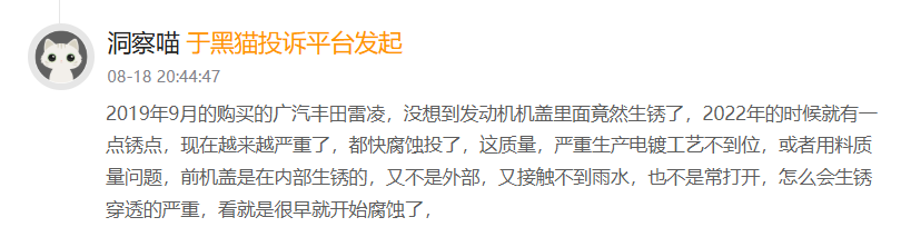 8月18日,有车友投诉称,自己于2019年9月的购买的广汽丰田雷凌双擎,没想到发动机机盖里面竟然生锈了,2022年的时候就有一点锈点,现在越来越严重了,都快腐蚀投了,这质量,严重怀疑是生产电镀工艺不到位,或者用料质量问题。