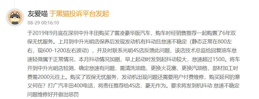 DoNews9月23日消息,近日,有车友在黑猫平台投诉称,自己于2019年9月底在广东深圳中升丰田4S店购买了2019款广汽丰田雷凌,购车时经销售推荐一起购置了6年双保无忧服务。