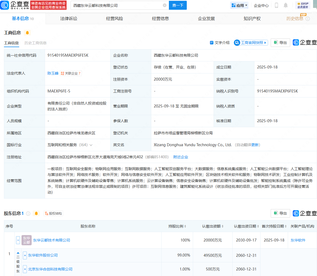 企查查APP显示,近日,西藏东华云都科技有限公司成立,法定代表人为陈玉峰,注册资本为2亿元,经营范围包含:物联网应用服务;互联网数据服务;人工智能双创服务平台;人工智能公共数据平台等。企查查股权穿透显示,该公司由东华软件(002065)控股东华云都技术有限公司全资持股。